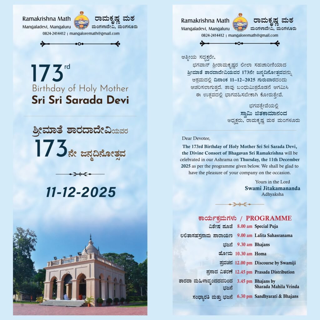 The 173rd Birthday Celebration of Holy Mother Sri Sarada Devi will be observed at Ramakrishna Math, Mangaluru on Thursday, the 11th December, 2025 as per the programme given below. We invite all our devotees, friends and well wishers to attend the programme.