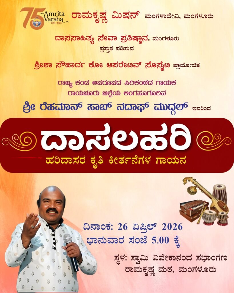 Ramakrishna Mission, Mangalore in association with Dasa Sahitya Seva Pratishthana, Mangalore is organizing Dasa Lahari in Swami Vivekananda Auditorium from 5.00 pm to 7.30 pm on Sunday, the 26th April 2026 . Sri Rehaman Saab Nadaf Mudgal, Raichur will be rendering compositions of various saints & mystics on that day.