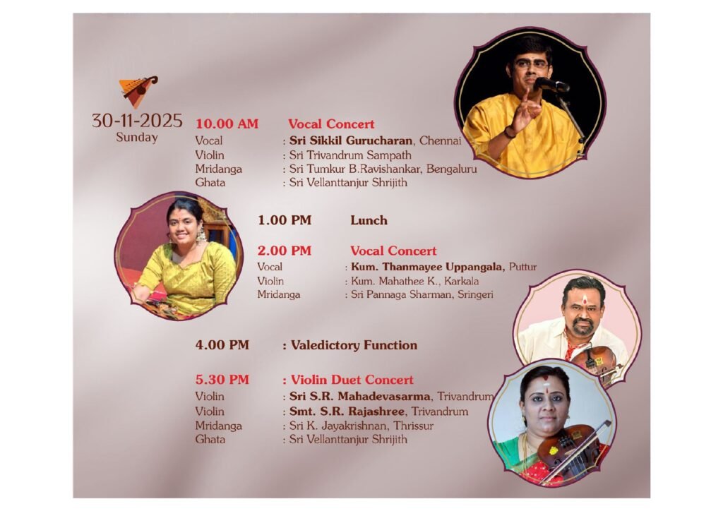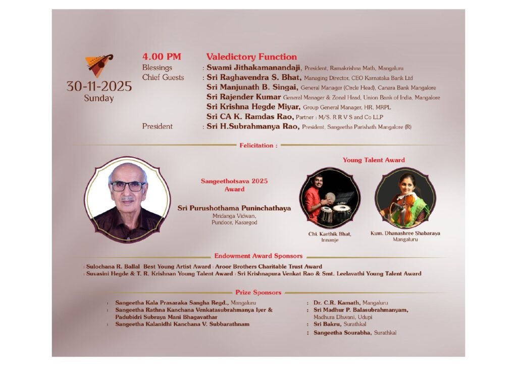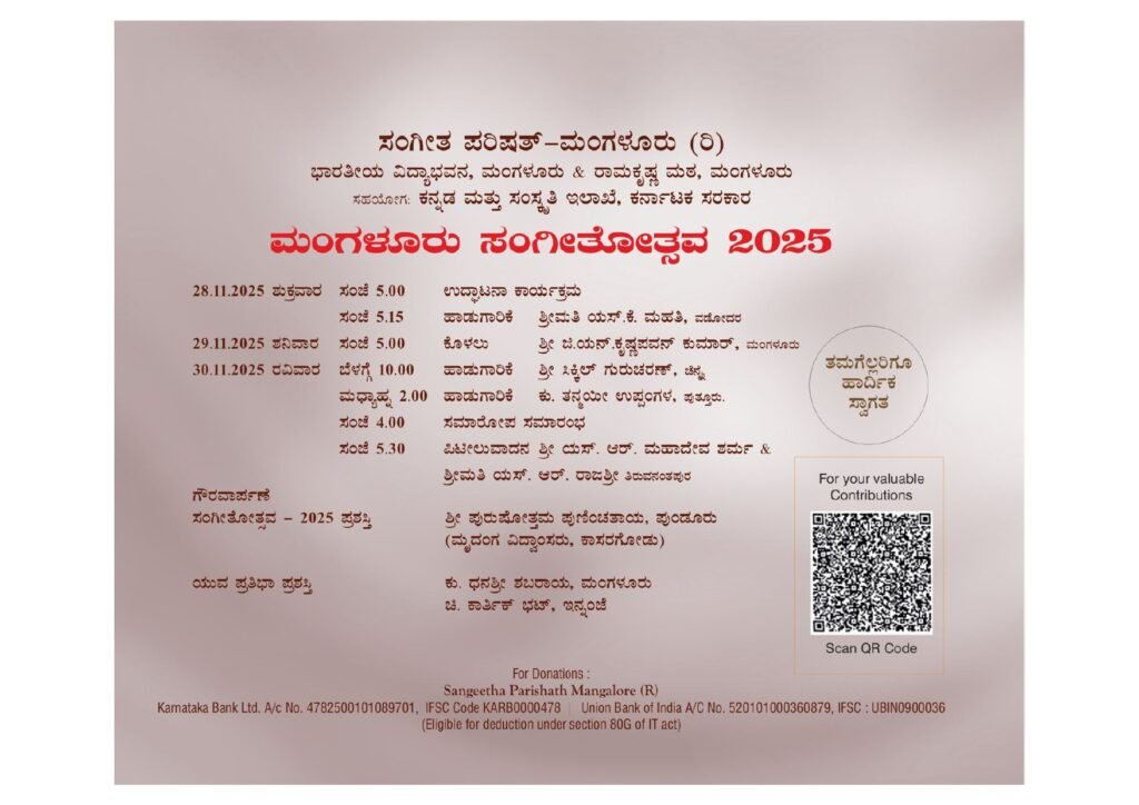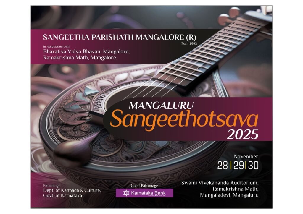 On the occasion of Amrita Varsha – 75th Anniversary of Ramakrishna Mission, Mangaluru, Ramakrishna Mission, Mangaluru in association with Sangeetha Parishath Mangalore & Bharatiya Vidya Bhavan, Mangalore is organizing Mangaluru Sangeethotsava 2025 from 28th November 2025 to 30th November 2025 at Swami Vivekananda Auditorium. Details of the programme are given in the following pages. We invite all the interested to attend the programme & enjoy the renditions.