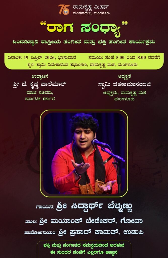 Sri Siddharth Belmannu, Bengaluru will be singing Hindusthani Classical & devotional songs in Raga Sandhya at Swami Vivekananda Auditorium from 5 pm to 8 pm on Sunday, the 19th April 2026 on the occasion of Akshaya Tritiya. He will be accompanied by Sri Mayank Bedekar, Goa on the Tabla & Sri Prasad Kamath, Udupi on the Harmonium.