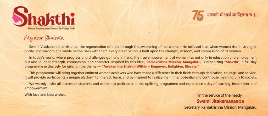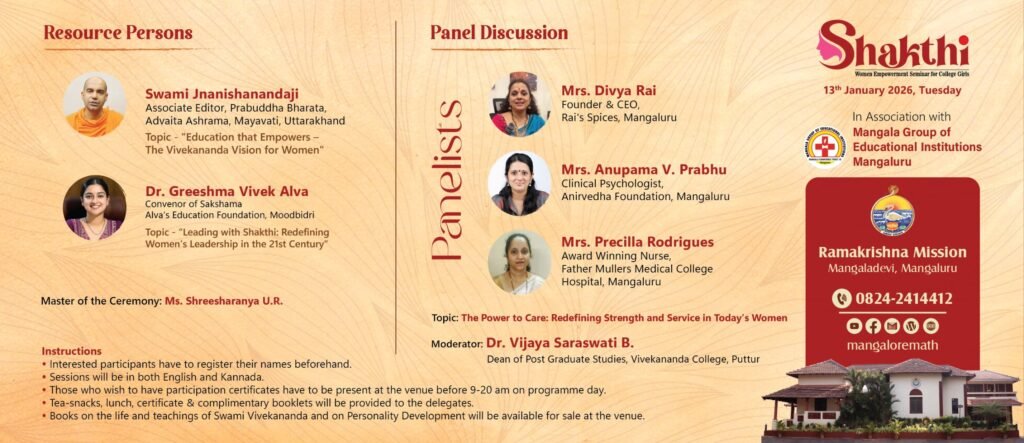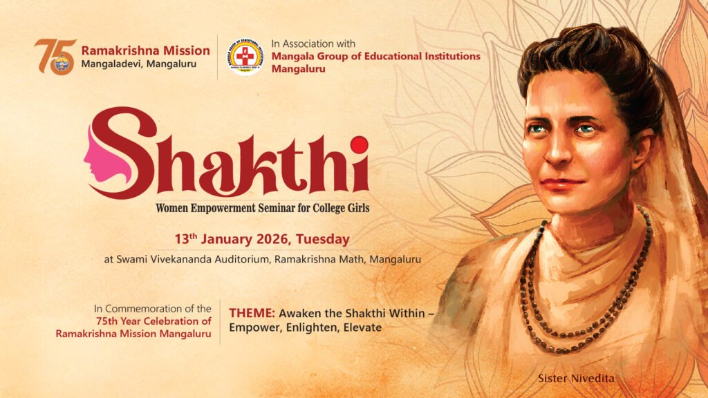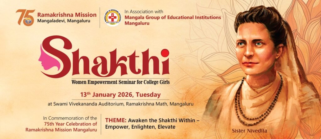 On the occasion of Amrita Varsha (75 Years), Ramakrishna Mission, Mangalore is organizing Shakthi ’26 – Women Empowerment Seminar exclusively for college girls in Swami Vivekananda Auditorium, Ramakrishna Math, Mangalore on Tuesday, the 13th January 2026 at 9 am. Details of the programme are given below. Entry is through Prior Registration.