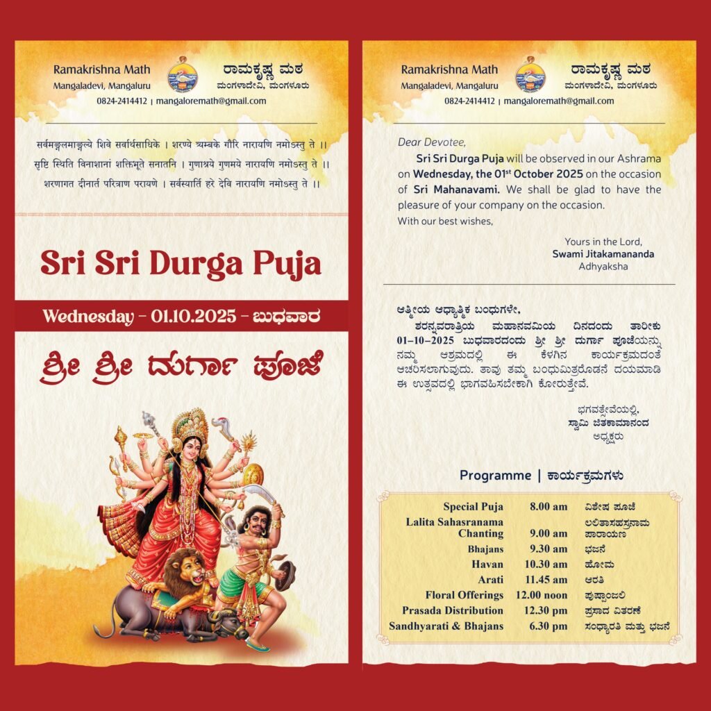 Sri Sri Durga Puja will be observed in our Ashrama on the Mahanavami day, i.e. on the 1st October 2025, Wednesday as per the programme given below. We invite all our devotees, friends & well-wishers to attend the programme.