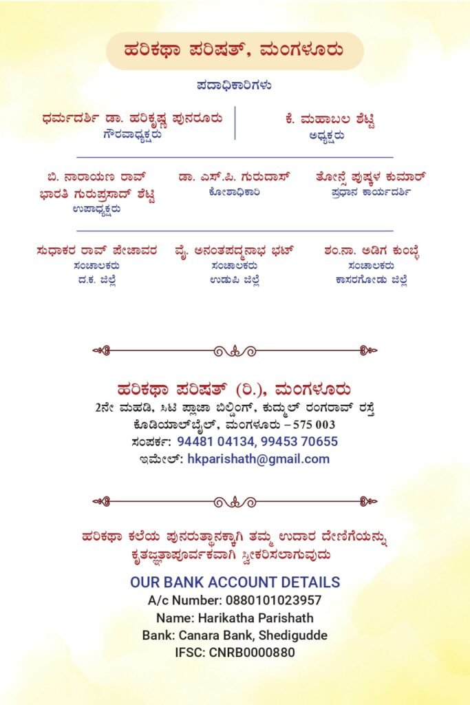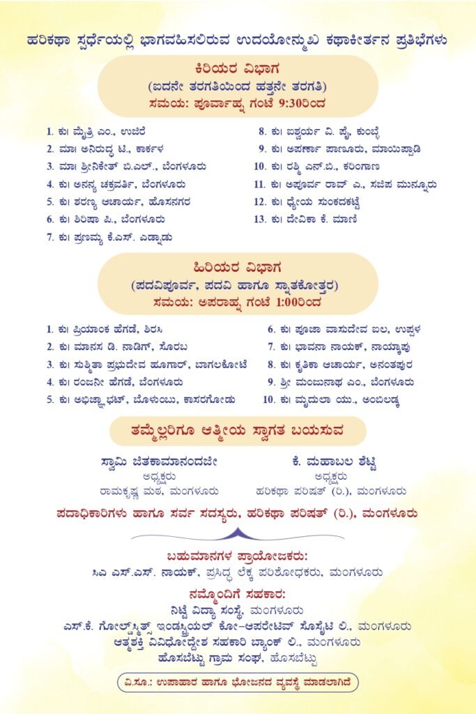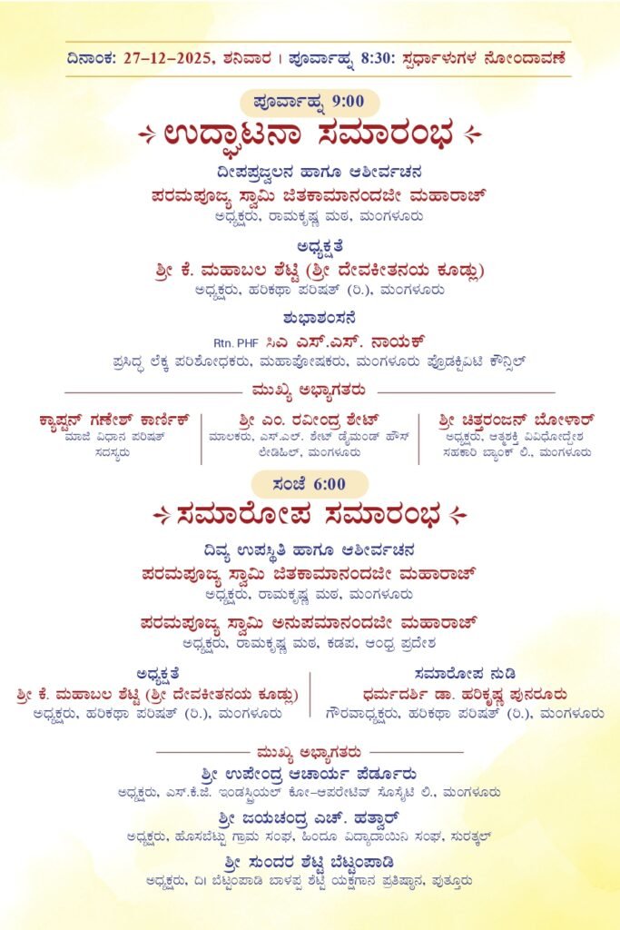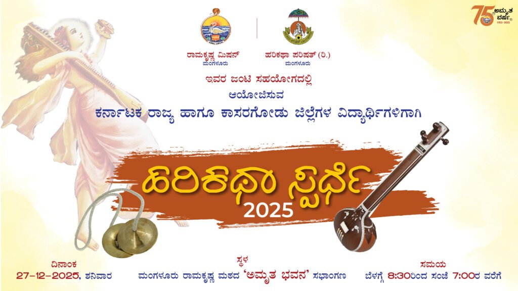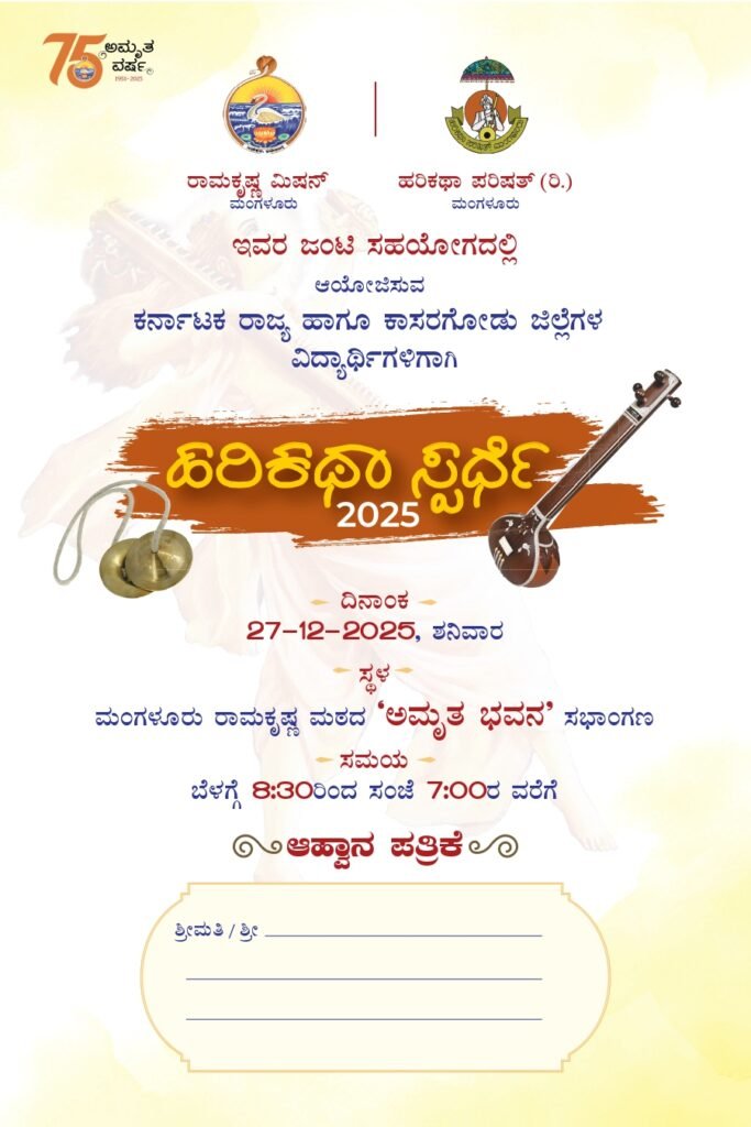 On the occasion of 75th Anniversary of Ramakrishna Mission, Mangalore, the Ashrama in association with Harikatha Parishat, Mangalore is organizing State Level Harikatha Competition for Students & Youths in the Ashrama on Saturday, the 27th December 2025 at 9 am as per the programme given in the invitation below. Swami Jitakamanandaji will inaugurate the programme and Swami Anupamanandaji, Head, Ramakrishna Math, Kadapa, Andhra Pradesh will grace the concluding session. We invite all our friends, well wishers & devotees to attend the programme and encourage the art & artists.