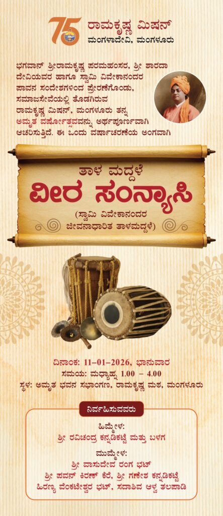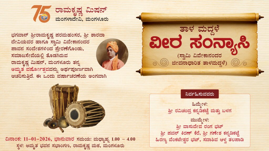 On the occasion of Amrita Mahotsava of Ramakrishna Mission, Mangaluru , we are organizing a special Programme, Talamaddale based on on the life of Swami Vivekananda titled, “Veera Sanyasi” on Sunday, the 11th January 2026 from 1 pm to 4 pm at Amrita Bhavana Sabhangana as per the programme given below: